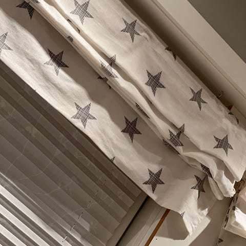 Foeret liftgardin med ringband og borrelås i topp på gardin. (Se bilde nr. 3)