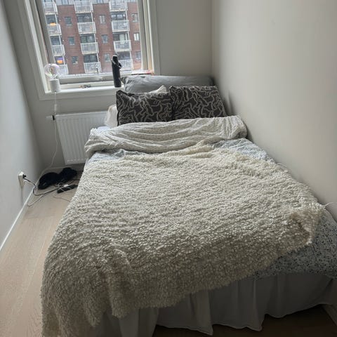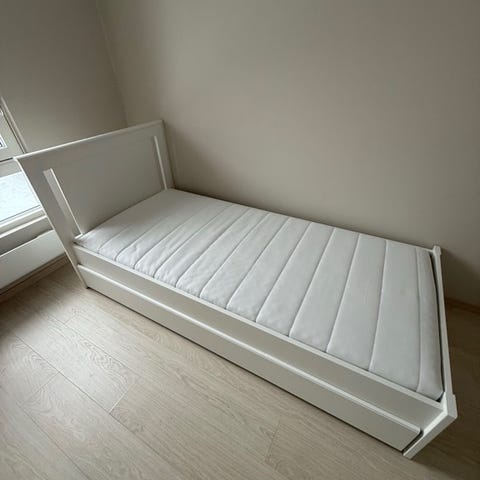Selger min pålitelige IKEA-seng, perfekt for en god natts søvn. Sengen har målene 120 cm x 200 cm, og jeg har alltid funnet den å være romslig og komfortabel. Den er ideell for et mindre soverom eller som en gjesteseng.