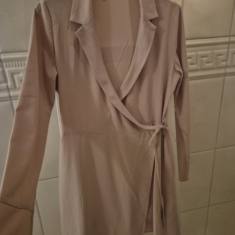 Ny omslagskjole i viskose M. Beige og svart mønster.
