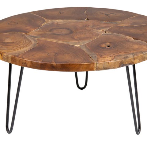 Dette unike, industrielle sofabordet i tre er et tidløst tillegg til hjemmet. Den unike tønneformede basen gir bordet en industriell stil.