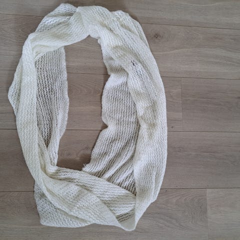 Ca 30 cm bredt og 80 cm langt - men dobbelt siden det er hals; går to ganger rundt hodet