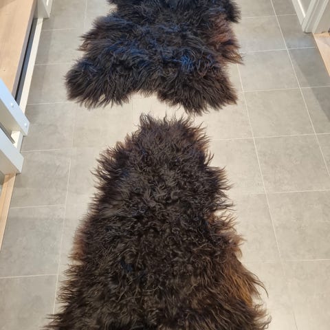 Skinnfelle vurderes solgt. Håndvevd oppside med 10 saueskinn ( kostet 1000 per stk )håndsydd underside. Passer perfekt til å ha på seng på for eksempel hytte eller en utrekksseng. Sauseskinnet er lyst og fint og skinnfellen har ingen flekker.