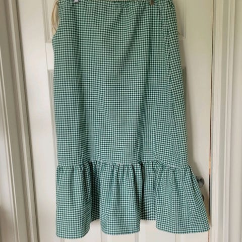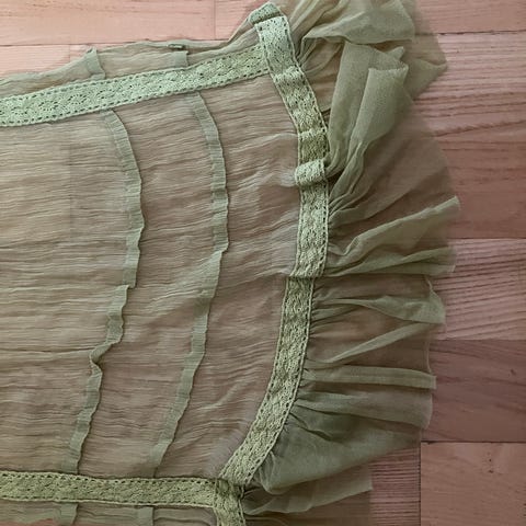 Skjørtet er i en mintgrønn farge. Er transparent med underskjørt. På den øverste delen er det små glitrende stener spredt rundt. Skjørtet er ikke brukt.