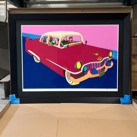 Innrammet med kunstglass. Utvendige mål 76 x 100 cm.