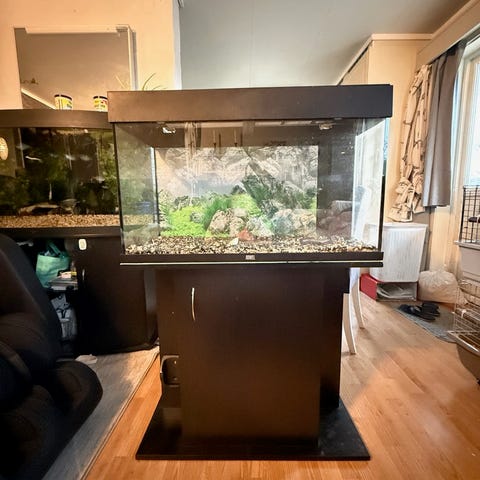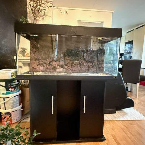 Brukt 600 L 6 år (165×56×60)(total H 141 cm), skap,fluval FX6 2 år, varmekolbe eheim 3 år ,led lys lumax