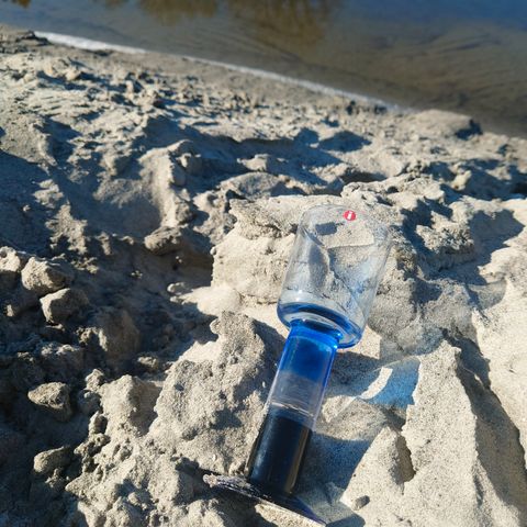 Fatet er blankt med blå detaljer.