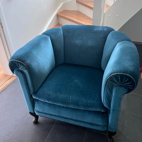 Stolene ble restaurert på 90 tallet og er lite brukt siden det, så de er helt plettfrie. Stoffet er utrolig slitesterkt og har ingen skader.