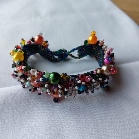 Dekorativt og forseggjort lykkearmbånd med perler i allle regnbuens farger. Bred elastikk som passer et litt kraftig håndledd eller bare ha det liggende til pynt