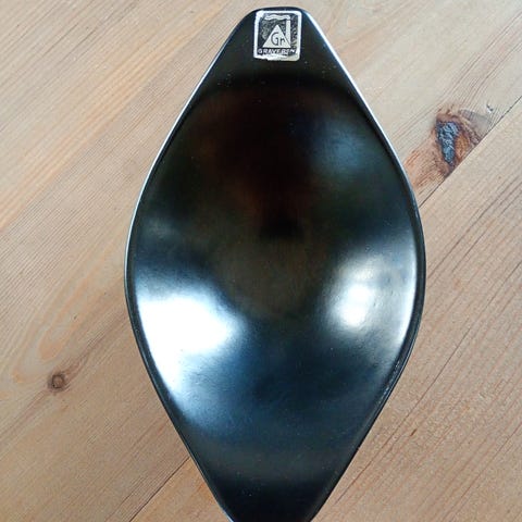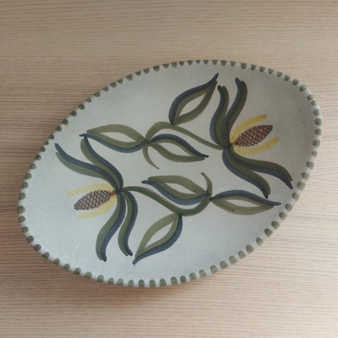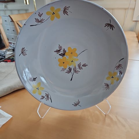 Flott halvdypt fat i keramikk med flott håndmalt dekor. Litt krakelering i bunnen ellers pen stand. 27 x 20 cm. Høyde opptil 6 cm. Kan sendes, jeg pakker godt.