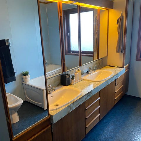 Ubrukt, pakket i original eske. Inkluderer speilskap, servant i porselen, underskap. Pluss Led lystopp for å monteres over speilskap (se bilder). Se bilde for komplett mål. Ikke med rørlegger deler og vannkrane. Må hentes i Sandnes, ferdig prutet ( ny pris ca 5500)
