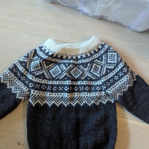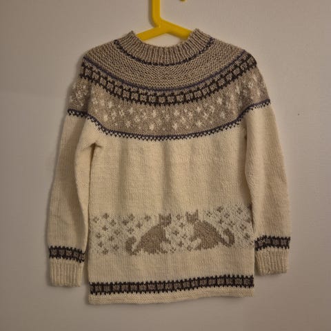 Genseren er strikket i hobby-garn fra Viking. Genseren har følgende: Hel lengde 42 cm, armlengde 25 cm, overvidde 66 cm.