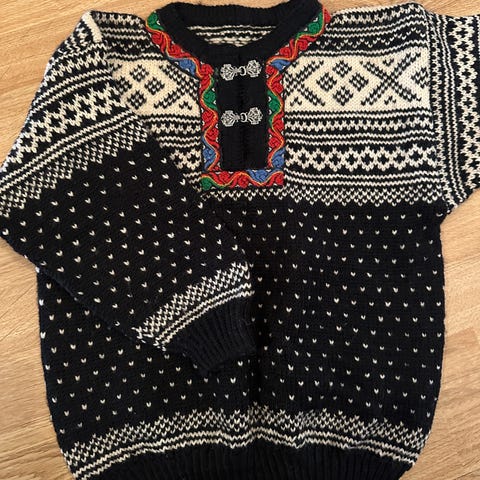 Selger koselig Setesdalgenser i str ca S. Passer til dame, gutt eller jente. Se mål på bildene. Nydelig strikket i vaskbar ull som ikke klør.