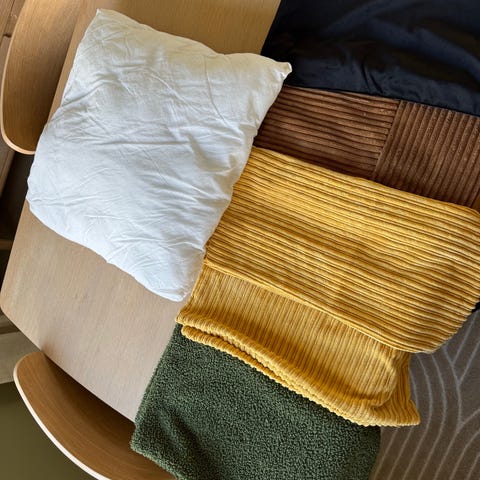 Nye og ubrukte spisebrikker i stoff av fletta hamp.