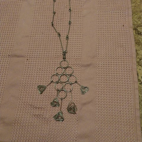 Selger her et meget pent kjede med anheng for til sammen kr 100,- + porto. Smykkene er flotte hver for seg også. Materiale vet jeg ikke hva er, men kan ligne både sølv og tinn. Hel lengde på kjede fra lås til anheng er 36 cm. Hele kjedet 72 cm. Ser ingen stempler.