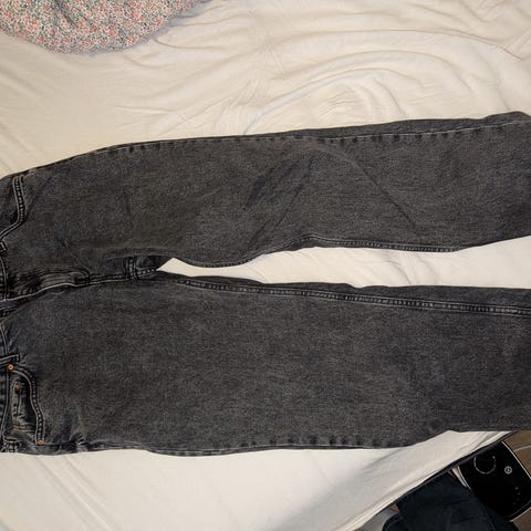 Svart bukse fra Cubus med en mom-fit stil. Jeans-liknende stoff, lommer foran og falske lommer bak. Litt kort i bukseben-lengden, men dette går helt fint om man er gjennomsnittlig høy eller lavere (jeg er 166 cm og de sitter fint rett over anklene). Bittelitt liten i størrelsen. Falmet litt i svart-fargen (synes det gir den et litt kult utseende), men ingen synlige bruksmerker. Knapp og glidelås i livet (høyt liv). Selges da den ikke passer lenger pga fødselskropp.