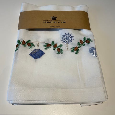 Kjøkkenhåndklær med julemotiv. 4 stykk. 40 kroner per stykk.