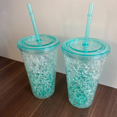 Drikkebeger i plast med sugerør selges i sett av 2.