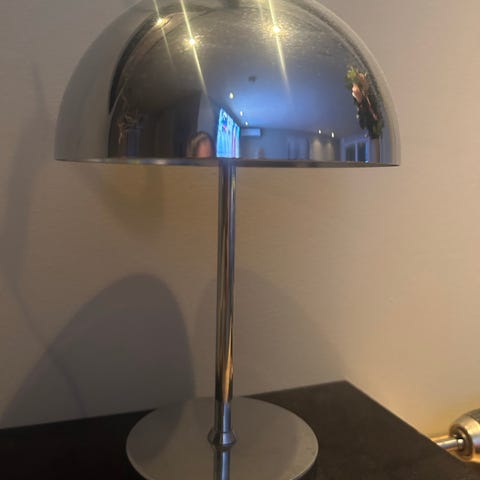 Metallstamme trukket med foldet bomullsstoff. Plate av herdet glass. Ø 40 cm. H 11 cm. 3 x E14. Maks 3 x 40W. Lampen er lett å henge på en takhake og kan dimes helt. 3 stk led lyspærer inkludert.