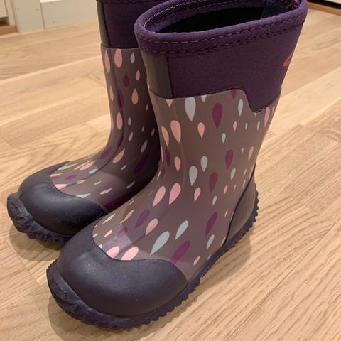 Fin Skofus barnegummistøvel. Støvelen er vanntett. Den har flotte blå og lilla hjerte-motiver på skaftet. Støvelen har uttakbar termo såle og tekstilfor og en lett støtabsorberende gummisåle. Modellen er normal i størrelsen.