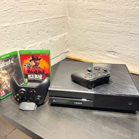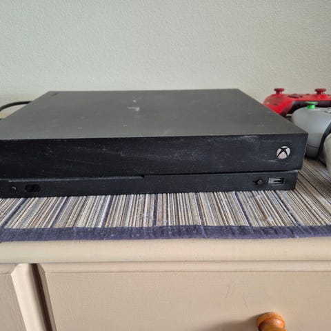 Selger godt velholdt Xbox One X med 1 TB lagringsplass. Fremstår som ny og kan brukes som gave. Følger med 10 populære spill og alt av kontroller, kabler og esken.