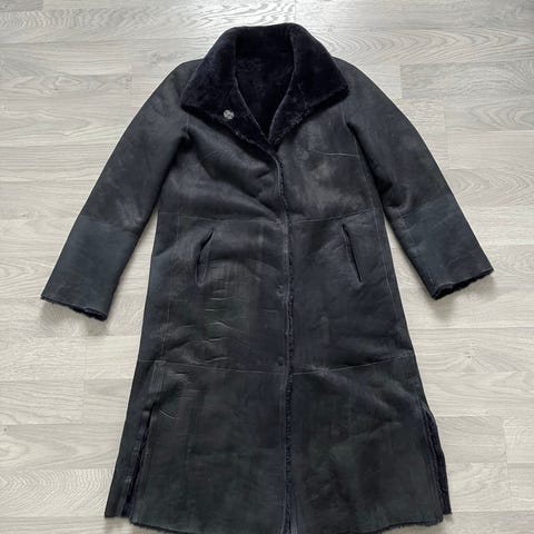 THE ELIZABETH SHANNON semsket skinn jakke, ekte skinn, foret - isolert syntetisk polstring, avtakbar krage, to lommer, glidelås, farge mellom grå og svart, lengde 84cm, erme lengde 62cm, bryst 58cm, str.38