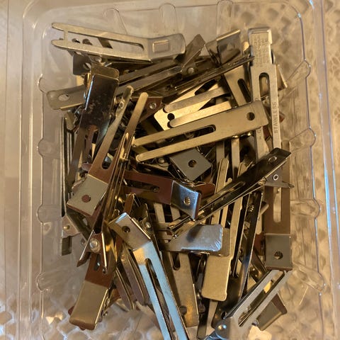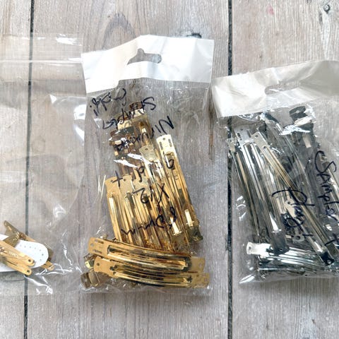 En liten boks med hårklipps/ klemmer i gull farge
