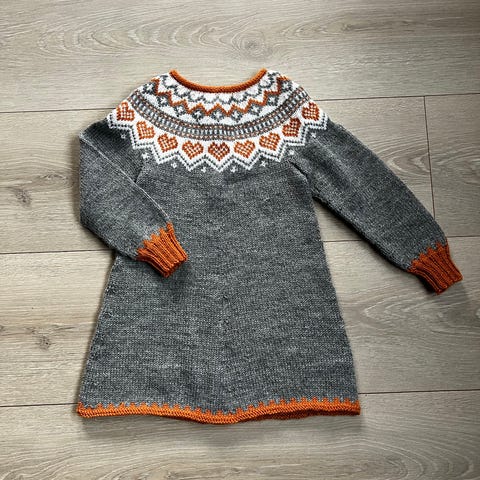 Ubrukt Strikket kjole i Marius mønster. Knytting i livet. Farge grå med lyserosa detaljer på skuldrene. Selges grunnet for liten til jenta mi.