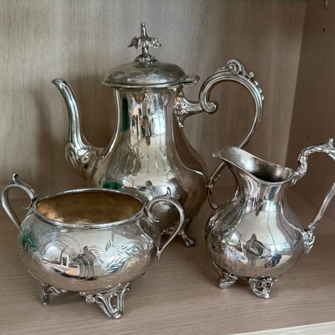 Bestemors gamle kaffesett i sølvplett, merket : PB 60 gram Alpacca 151.