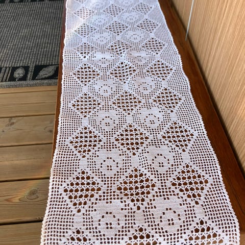 Bordløperen er ubrukt. Den er heklet i 100 prosent Merino ull, noe som gjør at den ligger støtt og godt til underlaget. Den kan også brukes som pynt over gammel stol eller sitteunderlag utendørs for to.