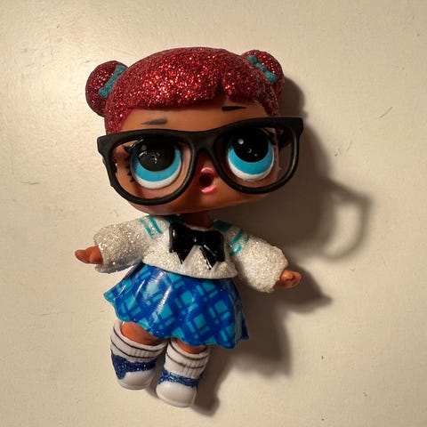 Liten dukke med antrekk, sko, briller og drikkeflaske.