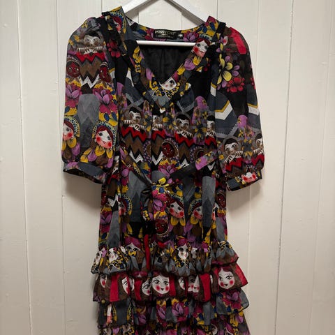 Nydelig Pia Tjelta Kirsten Dress kjole. En kjole med 3/4 ermer, rund hals og rysjedetaljer. Fleksibelt bånd i linningen, knappelukking i halsen og folder på overdel og i skjørt. Pent brukt.