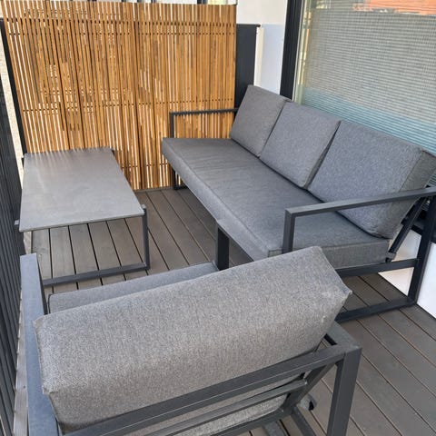 Pent brukt 4-seters utesofa fra Ygg og Lyng, sort metall og sorte puter. Modulbasert, så man kan sette den sammen som hjørnesofa, eller fire seter ved siden av hverandre. En av putene er lett solbleket, ellers er alle i god stand. Putene har vært lagret innendørs vinterstid.