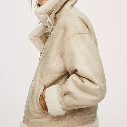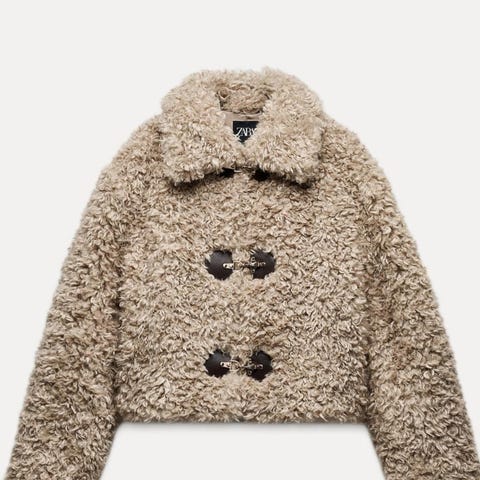 Imitert saueskinnjakke fra Zara i lys beige/eggshell farge. Brukt kun 1–2 ganger, men selges fordi jakken er liten i størrelsen. Størrelse small, passer best til XS–S.