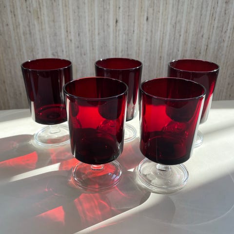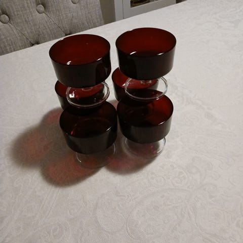 4 stk røde glass 10.5cm høy og 5.5cm i dia.100kr pr.stk