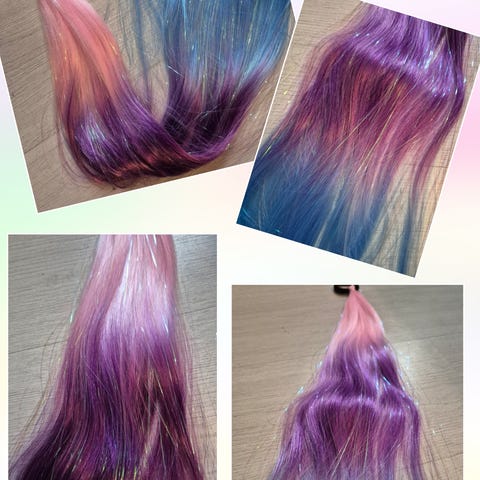 Syntetisk hår festet i strikk, lagt opp til å lage lang flette, eller du kan også bruke det som lang hestehale. (Se bilder)