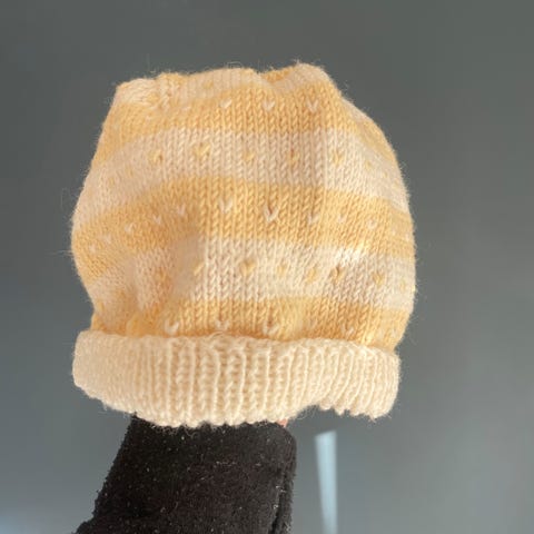 0-3 mnd. Nydelig, hjemmestrikket lue i gammelrosa. Kun vasket, ikke brukt.