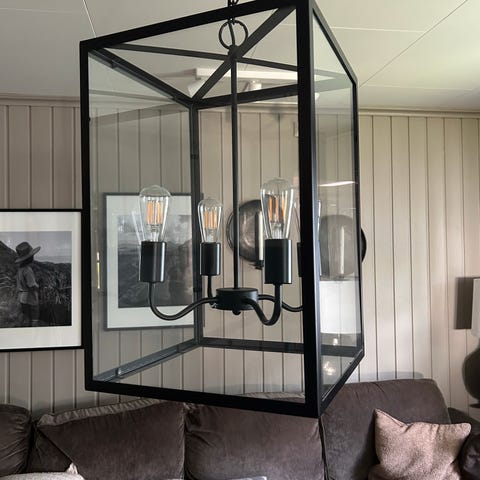 Metall, lakkert rustikt grå utenpå og slett hvit innvendig. Kan dimmes.