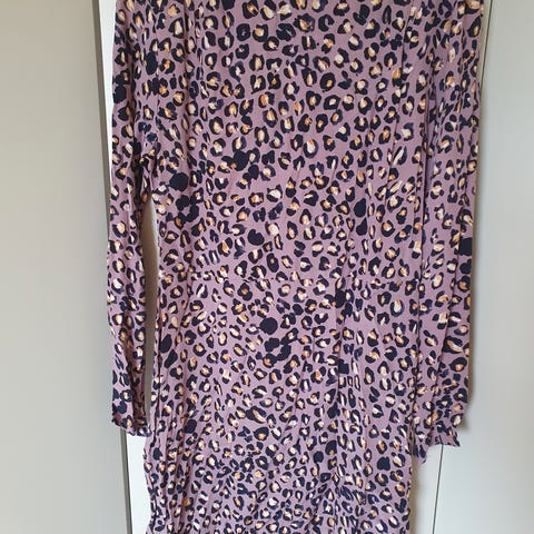 Blomstrete kjole fra HM, lite brukt, ingen nevneverdig slitasje. Størrelse 40. Hun på bildet er 174 cm høy og en normal str L. Kjolen er vid, så størrelsen er veldig fleksibel. To lommer. Polyester og litt elastitet. Ermene er lange og har strikk-linning. Knyting øverst. Lengde fra nakke (bakside) og ned er ca 120 cm.