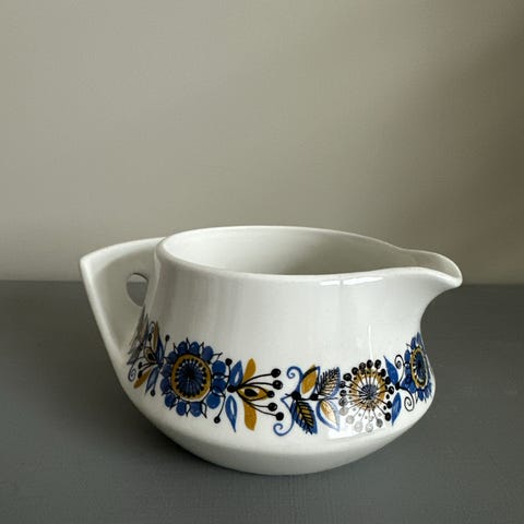 Nydelig mugge selges rimelig. Et ørlite skår langs kanten oppe, og noen merker i bunnen (se bilder). Nydelig på bordet eller til blomster. Ca 13,5 cm høy.