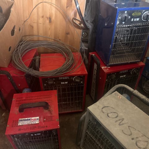 Selger 2 stk byggvarmere - byggtørke - varmeovn. Den ene er en 2 kw. Den kan kjøres på bare vifte uten varme, Den kan også kjøres på 1300 W og 2000 W. Det er termostat i begge. Den andre kan kjøres på bare vifte. Den kan også kjøres på ca 1800 W og 3000 W . Dette er en Master industrivifte. Begge selges samlet for kr 1000.-