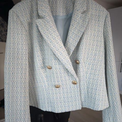 Ny lekker blazer i tweedstoff, med sort beslag, fake glidelåslommer og ermer sydd for å sitte som om du har brettet de opp, innsving i livet og ingen knapper foran. Veil.kr 400,- Selges kr 250,-(3)