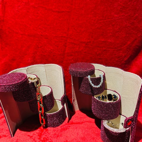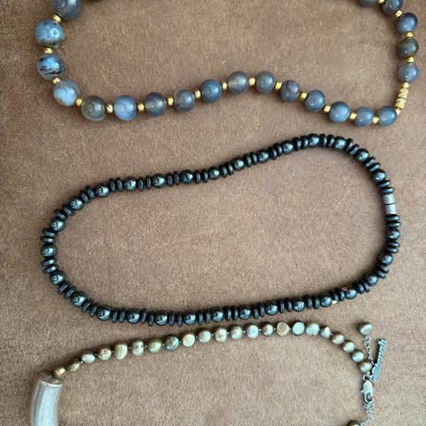 Armbånd camelfarget i silke, to rader. 19cm.Gullfarget charms (sølv) 3cm. Kr 100