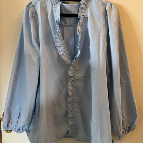 Ny flott bluse med tag, himmelblå og volanger Str M Selges kr 100,-(33)