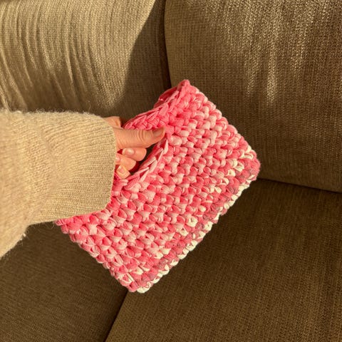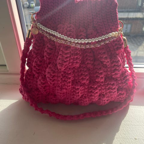 Søkeord: veske håndveske clutch bag gave gaver gavetips presang gaveide ideer gaveideer dame jente strikket trend statement merke designer rosa pink brodert blomster brodering mønster tekstil lommer glidelås knapper lomme stoff god plass grønn jul julegave julepresang julegavetips