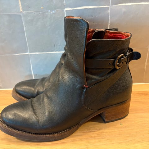 Flate ankelstøvletter laget i skinn. Produsert i Portugal. Nypris 2000,-. Pent brukt.
