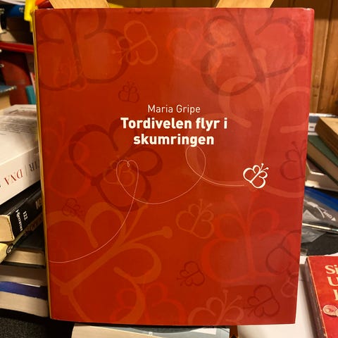 Tordivelen flyr i skumringen bok av Maria Gripe . Lest 1 gang, men den har vært veldig mange år i oppbevaring. Så det er bruksmerker på coveret. På en side inne i boksen har bitte litt papir blitt revet bort, samt det er noen merker. Ingen brettemerker eller noe sånt, de fleste sidene utenom den ene er i god stand. Boken 30 år gammel, det er 4 opplag, 1995.