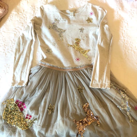 Nydelig gullskjørt, brukt til jul og nyttår. Strømpebuksa har et hull på rompa, men kan sende den med da den passer så godt til skjørtet på vinterstid. Jenta på bildene er nylig blitt 12år, men skjørtet er da i trangeste laget.