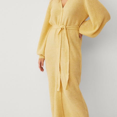 Lang strikkekjole str L. 80%viscose, 20 % polyester. Lite brukt. Behagelig kjole.