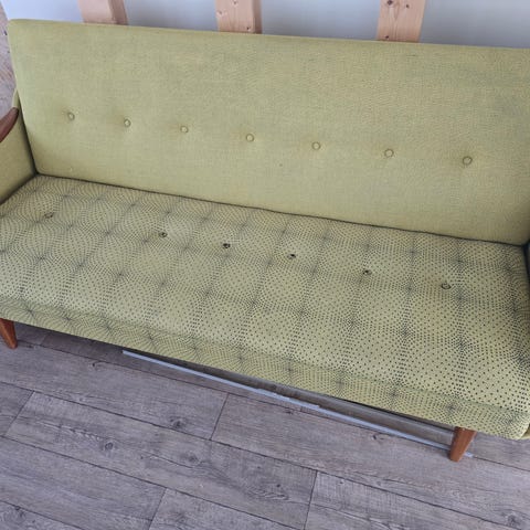 Rød sovesofa i teak. Vært strøken helt til vi hadde katt i hus en kort periode som klorte den opp som vist på bilde.