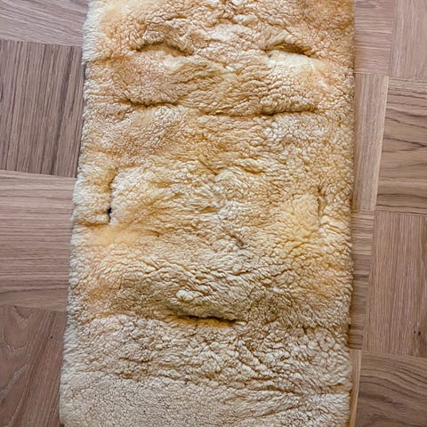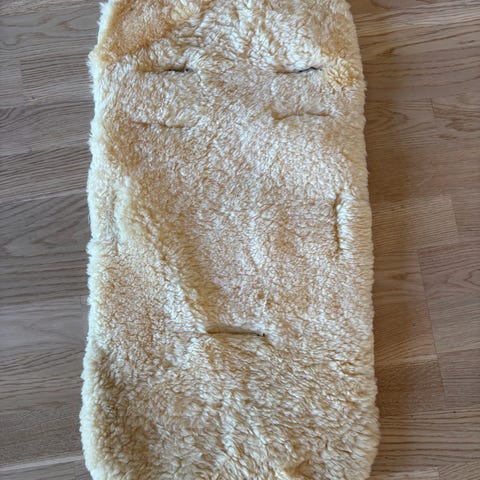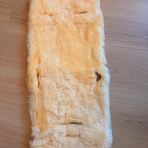 Pent brukt lammeskinn til vogn. Har hull til selen.